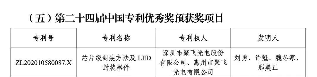 了解更多 >近日,國(guó)家知識(shí)產(chǎn)權(quán)局公布第二十四屆中國(guó)專利獎(jiǎng)評(píng)審結(jié)果并公示,聚飛光電“芯片級(jí)封裝方法及LED封裝器件”(專利號(hào):ZL202010580087.X)專利榮獲“中國(guó)專利優(yōu)秀獎(jiǎng)”,繼“一種LED支架及具有該支架的LED”(專利號(hào):ZL201110115645.6)獲得第二十屆中國(guó)專利優(yōu)秀獎(jiǎng)后再獲此殊榮。