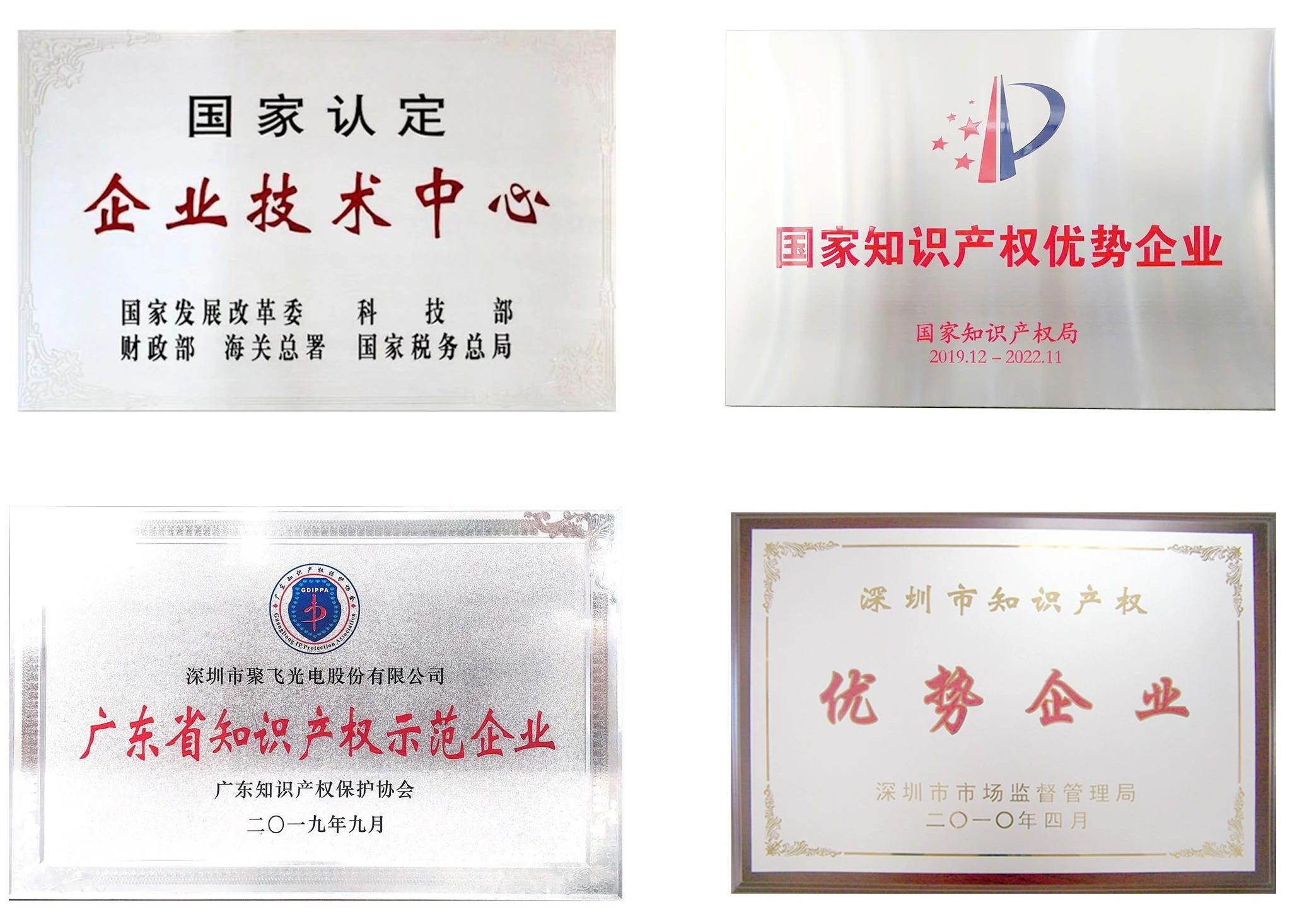 聚飛光電在LED核心技術(shù)領(lǐng)域擁有深厚的技術(shù)積累和國(guó)內(nèi)外專利的中長(zhǎng)期布局,專利涵蓋結(jié)構(gòu)、電子、封裝、超高清顯示技術(shù)等領(lǐng)先技術(shù)領(lǐng)域。聚飛企業(yè)技術(shù)中心獲“國(guó)家認(rèn)定企業(yè)技術(shù)中心”(我國(guó)最高級(jí)別的企業(yè)創(chuàng)新平臺(tái))、廣東省工程技術(shù)研究中心、深圳市企業(yè)技術(shù)中心認(rèn)證,基于技術(shù)積累與創(chuàng)新實(shí)踐累計(jì)申請(qǐng)專利600余項(xiàng),其中發(fā)明專利占比約55%。同時(shí)聚飛積極與國(guó)際知名企業(yè)進(jìn)行戰(zhàn)略合作獲得專利授權(quán),自有專利與戰(zhàn)略專利合作雙線推進(jìn),深化知識(shí)產(chǎn)權(quán)戰(zhàn)略布局,先后獲得國(guó)家知識(shí)產(chǎn)權(quán)優(yōu)勢(shì)企業(yè)、廣東省知識(shí)產(chǎn)權(quán)示范企業(yè)、深圳市知識(shí)產(chǎn)權(quán)優(yōu)勢(shì)企業(yè)等國(guó)家級(jí)、省級(jí)、市級(jí)知識(shí)產(chǎn)權(quán)類榮譽(yù)獎(jiǎng)項(xiàng)。